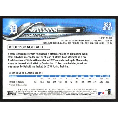 This is a 2018 Topps Niko Goodrum baseball card. The card is #639 and pictures show condition.