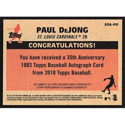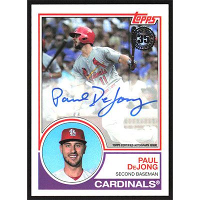This is a 2018 Topps '83 Autographs Paul DeJong autographed baseball card. This card has been signed, in blue, by Paul DeJong, and is certified authentic by Topps. The card is #83A-PD and pictures show condition.