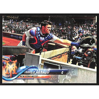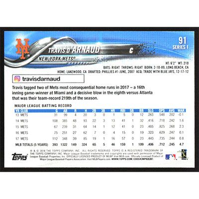 This is a 2018 Topps Travis d'Arnaud baseball card. The card is #91 and pictures show condition.