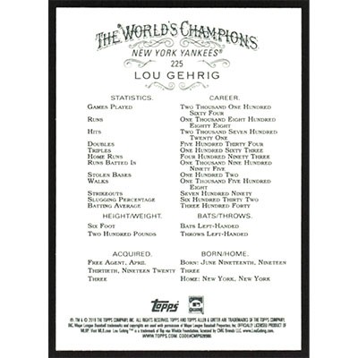 This is a 2018 Topps Allen & Ginter Lou Gehrig baseball card. The card is #225 and pictures show condition.