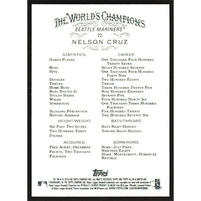 This is a 2018 Topps Allen & Ginter Nelson Cruz baseball card. The card is #72 and pictures show condition.