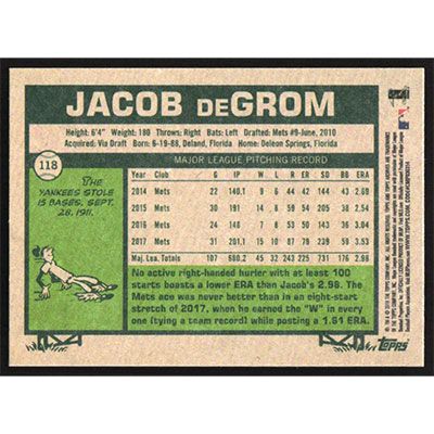This is a 2018 Topps Archives Jacob deGrom baseball card. The card is #118 and pictures show condition.