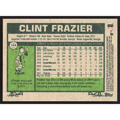 This is a 2018 Topps Archives Clint Frazier baseball card. The card is #144 and pictures show condition.