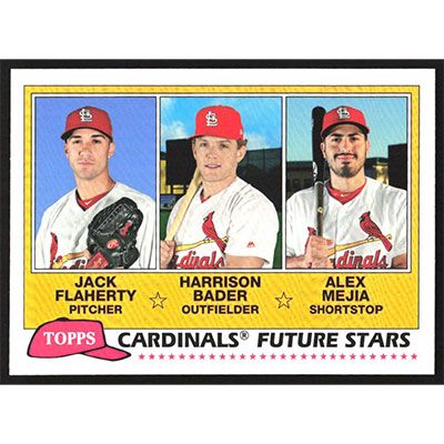 This is a 2018 Topps Archives '81 Future Stars Jack Flaherty, Harrison Bader and Alex Mejia baseball card. The card is #FS-STL and pictures show condition.
