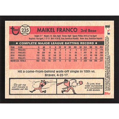 This is a 2018 Topps Archives Gold Foil Maikel Franco baseball card. The card is #235 and pictures show condition. This card is limited; #'d 1/1. Team(s): Philadelphia Phillies