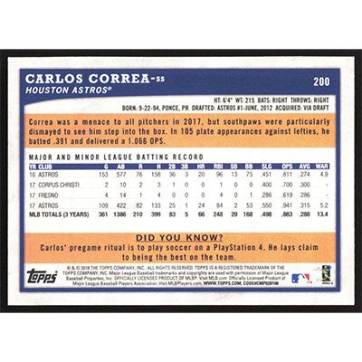 This is a 2018 Topps Big League Carlos Correa baseball card. The card is #200 and pictures show condition.