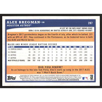 This is a 2018 Topps Big League Alex Bregman baseball card. The card is #287 and pictures show condition.