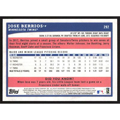 This is a 2018 Topps Big League Jose Berrios baseball card. The card is #292 and pictures show condition.