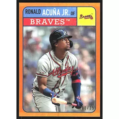This is a 2018 Topps Brooklyn Collection Orange Ronald Acuña Jr. baseball card. The card is #4 and pictures show condition. This card is limited; #'d 11/25.