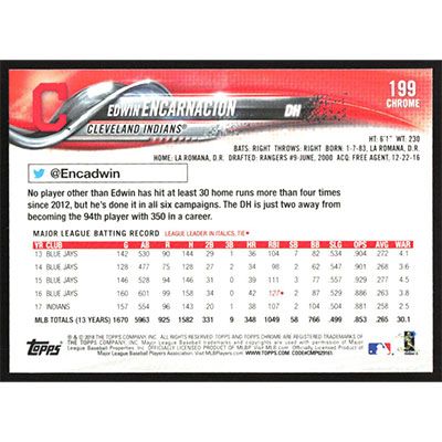 This is a 2018 Topps Chrome Edwin Encarnacion baseball card. The card is #199 and pictures show condition.