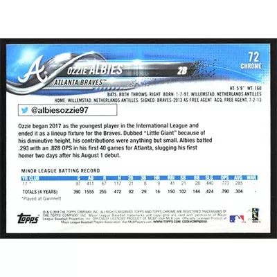 This is a 2018 Topps Chrome Ozzie Albies baseball card. The card is #72 and pictures show condition.
