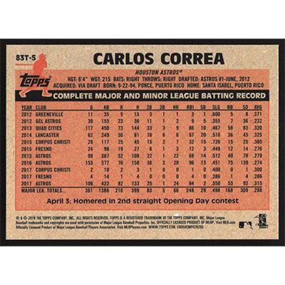 This is a 2018 Topps Chrome '83 Refractors Carlos Correa baseball card. The card is #83T-5 and pictures show condition.
