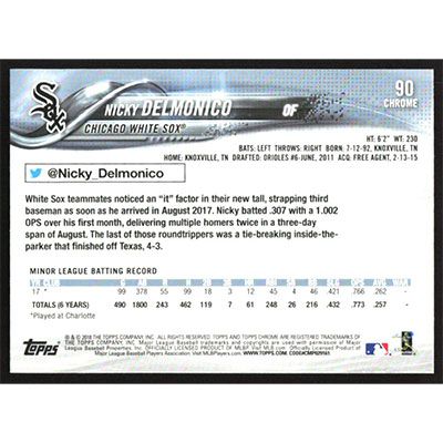 This is a 2018 Topps Chrome Nicky Delmonico baseball card. The card is #90 and pictures show condition.