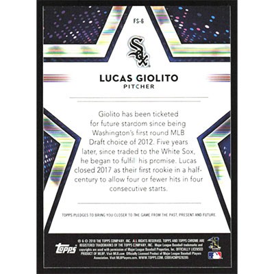 This is a 2018 Topps Chrome Future Stars Refractors Lucas Giolito baseball card. The card is #FS-6 and pictures show condition. Team(s): Chicago White Sox
