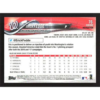 This is a 2018 Topps Chrome Pink Refractors Erick Fedde baseball card. The card is #76 and pictures show condition. Team(s): Washington Nationals Rookie Card (RC)