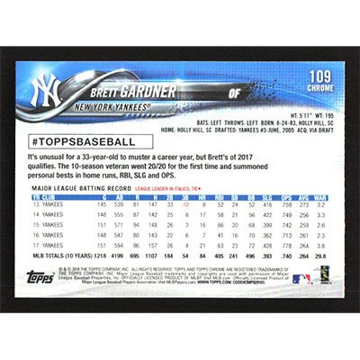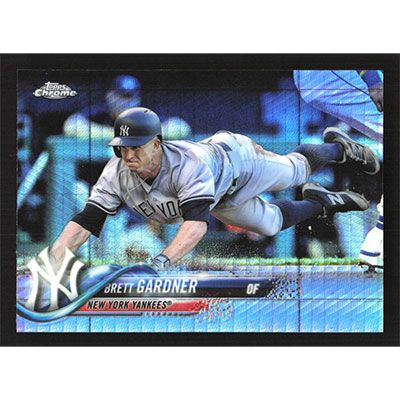 This is a 2018 Topps Chrome Prism Refractors Brett Gardner baseball card. The card is #109 and pictures show condition.