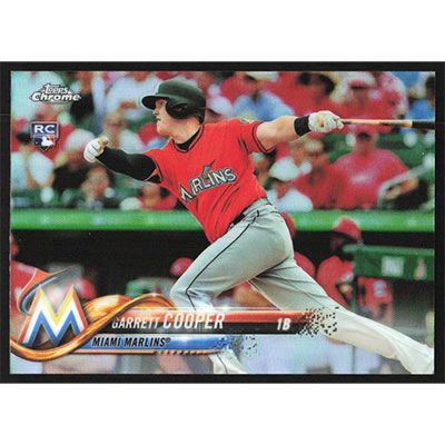 This is a 2018 Topps Chrome Refractors Garrett Cooper baseball card. The card is #188 and pictures show condition. Team(s): Miami Marlins Rookie Card (RC)