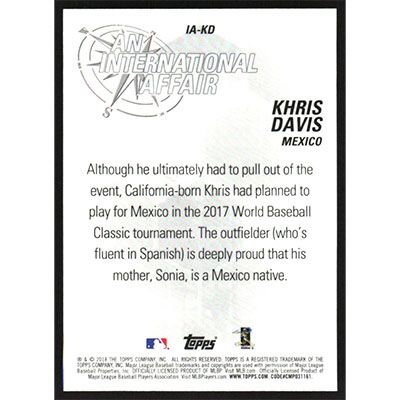 This is a 2018 Topps Chrome Update An International Affair Khris Davis baseball card. The card is #IA-KD and pictures show condition. Team(s): Oakland Athletics