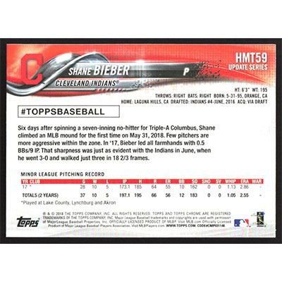 This is a 2018 Topps Chrome Update Edition Shane Bieber baseball card. The card is #HMT59 and pictures show condition. Team(s): Cleveland Indians Rookie Card (RC)