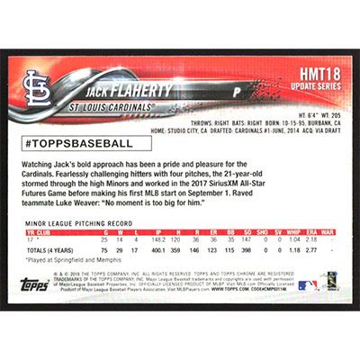 This is a 2018 Topps Chrome Update Jack Flaherty baseball card. The card is #HMT18 and pictures show condition. Team(s): St. Louis Cardinals Rookie Card (RC)