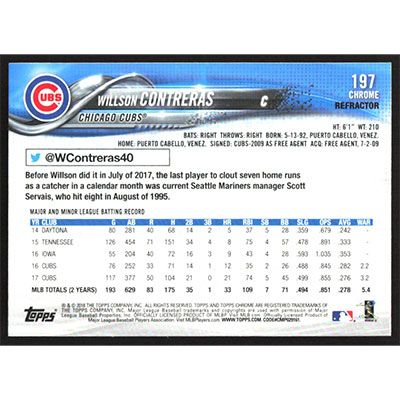 This is a 2018 Topps Chrome X-Fractors Willson Contreras baseball card. The card is #197 and pictures show condition.