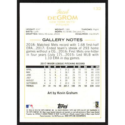 This is a 2018 Topps Gallery Jacob deGrom baseball card. The card is #132 and pictures show condition.