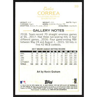 This is a 2018 Topps Gallery Carlos Correa baseball card. The card is #39 and pictures show condition.
