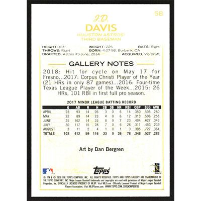 This is a 2018 Topps Gallery J.D. Davis autographed baseball card. This card has been signed, in blue, by J.D. Davis, and is guaranteed authentic by Ballcardz.com. The card is #58 and pictures show condition.