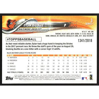 This is a 2018 Topps Gold Dylan Bundy baseball card. The card is #3 and pictures show condition. This card is limited; #'d 1341/2018. Team(s): Baltimore Orioles