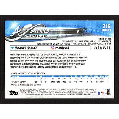 This is a 2018 Topps Gold Max Fried baseball card. The card is #316 and pictures show condition. This card is limited; #'d 0917/2018. Team(s): Atlanta Braves Rookie Card (RC)