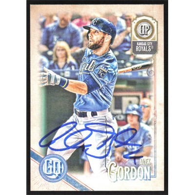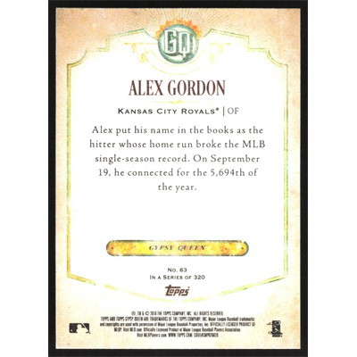 This is a 2018 Topps Gypsy Queen Alex Gordon autographed baseball card. This card has been signed, in blue, by Alex Gordon, and is guaranteed authentic by Ballcardz.com. The card is #63 and pictures show condition.