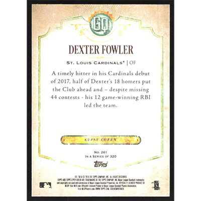 This is a 2018 Topps Gypsy Queen Missing Blackplate Dexter Fowler baseball card. The card is #261 and pictures show condition. Team(s): St. Louis Cardinals