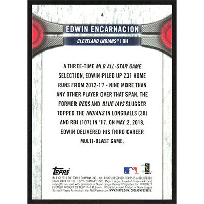 This is a 2018 Topps National Baseball Card Day Edwin Encarnacion baseball card. The card is #4 and pictures show condition.