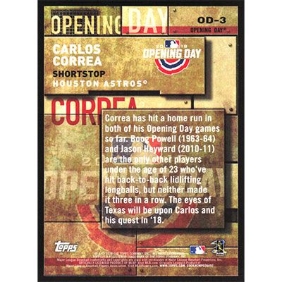 This is a 2018 Topps Opening Day Insert Carlos Correa baseball card. The card is #OD-3 and pictures show condition.