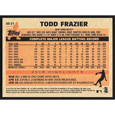 This is a 2018 Topps Update '83 Todd Frazier baseball card. The card is #83-21 and pictures show condition.