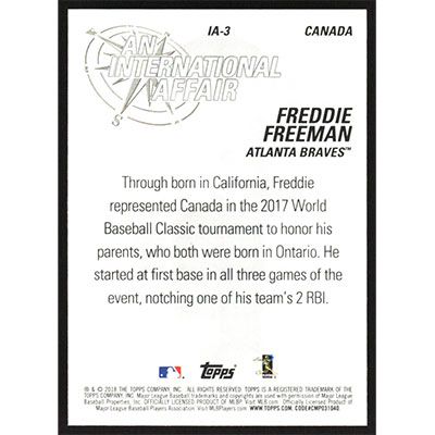 This is a 2018 Topps Update An International Affair Freddie Freeman baseball card. The card is #IA-3 and pictures show condition.