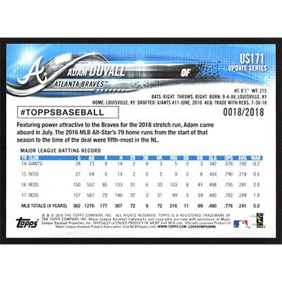 This is a 2018 Topps Update Gold Adam Duvall baseball card. The card is #US171 and pictures show condition. This card is limited; #'d 0018/2018. Team(s): Atlanta Braves