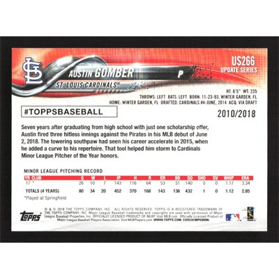 This is a 2018 Topps Update Gold Austin Gomber baseball card. The card is #US266 and pictures show condition. This card is limited; #'d 2010/2018. Team(s): St. Louis Cardinals Rookie Card (RC)