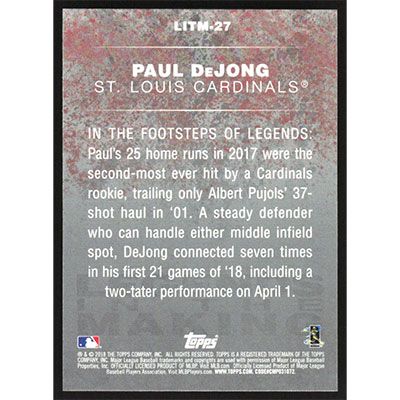 This is a 2018 Topps Update Legends in the Making Blue Paul DeJong baseball card. The card is #LITM-27 and pictures show condition. Team(s): St. Louis Cardinals