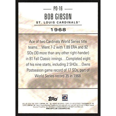 This is a 2018 Topps Update Postseason Preeminence Bob Gibson baseball card. The card is #PO-16 and pictures show condition. Team(s): St. Louis Cardinals