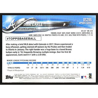 This is a 2018 Topps Update Rainbow Foil Shane Carle baseball card. The card is #US286 and pictures show condition. Team(s): Atlanta Braves Rookie Card (RC)