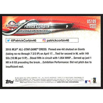 This is a 2018 Topps Update Patrick Corbin All-Star baseball card. The card is #US109 and pictures show condition.