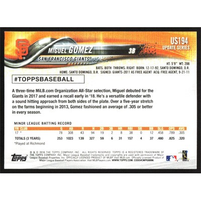 This is a 2018 Topps Update Miguel Gomez baseball card. The card is #US194 and pictures show condition. Team(s): San Francisco Giants Rookie Card (RC)