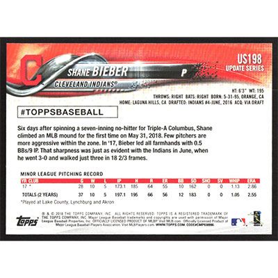 This is a 2018 Topps Update Shane Bieber baseball card. The card is #US198 and pictures show condition.