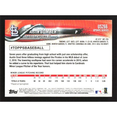 This is a 2018 Topps Update Austin Gomber autographed baseball card. This card has been signed, in blue, by Austin Gomber, and is guaranteed authentic by Ballcardz.com. The card is #US266 and pictures show condition.
