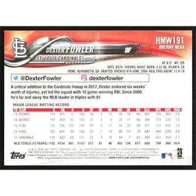 This is a 2018 Topps Wal-Mart Holiday Snowflake Dexter Fowler baseball card. The card is #HMW191 and pictures show condition. Team(s): St. Louis Cardinals