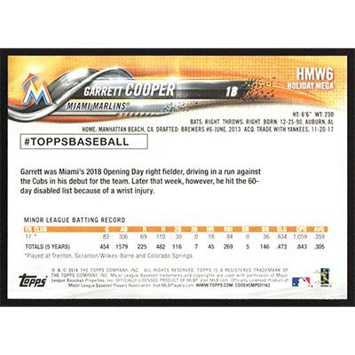 This is a 2018 Topps Wal-Mart Holiday Snowflake Garrett Cooper baseball card. The card is #HMW6 and pictures show condition. Team(s): Miami Marlins Rookie Card (RC)