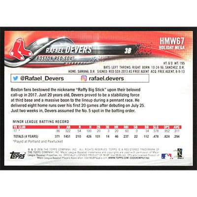 This is a 2018 Topps Wal-Mart Holiday Snowflake Rafael Devers baseball card. The card is #HMW67 and pictures show condition. Team(s): Boston Red Sox Rookie Card (RC)