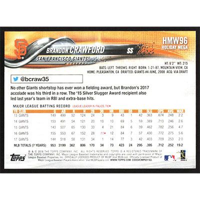 This is a 2018 Topps Wal-Mart Holiday Snowflake Brandon Crawford baseball card. The card is #HMW96 and pictures show condition. Team(s): San Francisco Giants