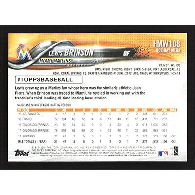 This is a 2018 Topps Wal-Mart Holiday Snowflake Metallic Lewis Brinson baseball card. The card is #HMW108 and pictures show condition. Team(s): Miami Marlins Rookie Card (RC)
